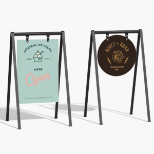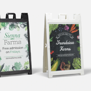 Turn foot traffic into paying customers with custom aluminum A-frame signs built to outperform ordinary sandwich boards. Fabricated from rust-proof aluminum and printed in full color with UV-cured inks, our sidewalk signs stay vivid through blazing sun, rain or wind — and fold flat in seconds for easy nightly storage.